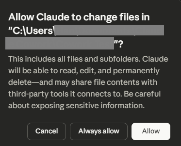 จากนั้น Claude จะขึ้นหน้าต่าง เพื่อขออนุญาตสิทธิ์ในการปรับเปลี่ยนไฟล์ใน Folder ที่เราเลือกครับ รวมถึงอาจแชร์ข้อมูลให้กับ third party tools ที่เราเชื่อมต่อไว้ ซึ่งหากใครกังวลเรื่องความเป็นส่วนตัวหรือข้อมูลที่มีความละเอียดอ่อน ก็อาจจะต้องไปหาวิธีป้องกันอีกทีนะครับ เช่น อาจจะซ่อนชื่อคน ชื่อบริษัทไว้ เป็นต้น