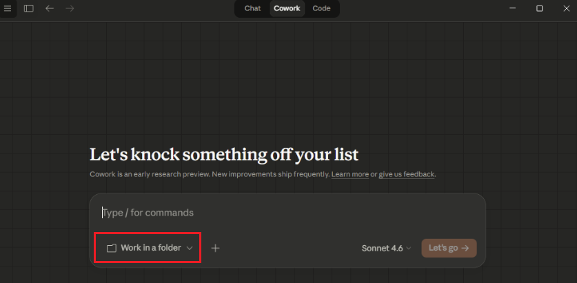 ดังนั้น เพื่อความปลอดภัย เราสามารถบอก Cowork ได้ครับ ว่าต้องการให้ทำงานแค่ใน Folder ที่เรากำหนดเท่านั้น โดยสามารถกดที่ปุ่ม Work in a folder จากนั้นก็ให้เลือก Folder ที่ต้องการให้ Claude เข้าไปทำงานได้เลยครับ โดยขอแนะนำให้สร้างเป็น Folder ใหม่ขึ้นมา เพื่อทดลองใช้งานตามในบทความก่อนนะครับ