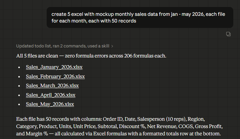 เนื่องจากหนึ่งในงานของที่ต้องใช้ Excel หลายๆ คน คือ งานที่ต้องรวมข้อมูลจากหลายๆ ไฟล์เข้าด้วยกัน เช่น รวมข้อมูลยอดขายรายเดือนจากหลายไฟล์มาไว้ในไฟล์เดียว เราก็จะมาลองให้ Cowork ทำงานแบบเดียวกันครับ โดยใช้คำสั่งนี้