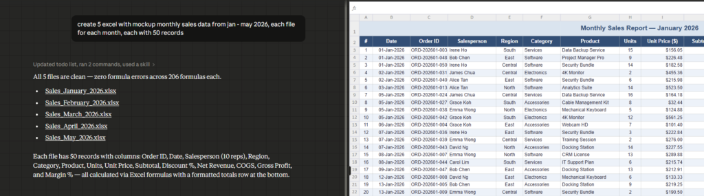 create 5 excel with mockup monthly sales data from jan – may 2026, each file for each month, each with 50 records