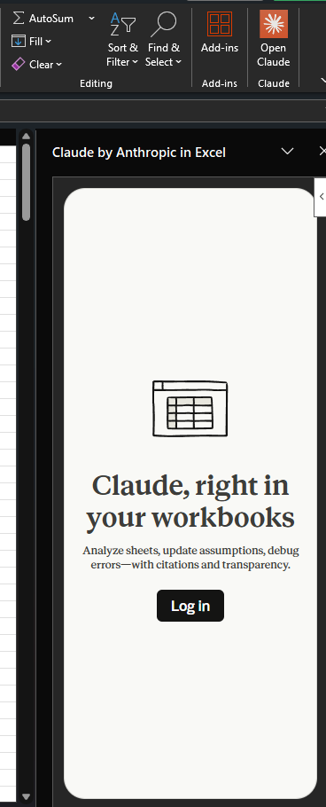 4. พอกดติดตั้งแล้ว ทาง Ribbon ด้านบนจะขึ้นปุ่ม Open Claude และหน้าต่างด้านล่างจะขึ้นให้เรา Log in ครับ