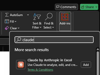 2. เข้าไปที่เมนู Add-ins ใน Excel แล้ว search หา Claude by Anthropic by Excel